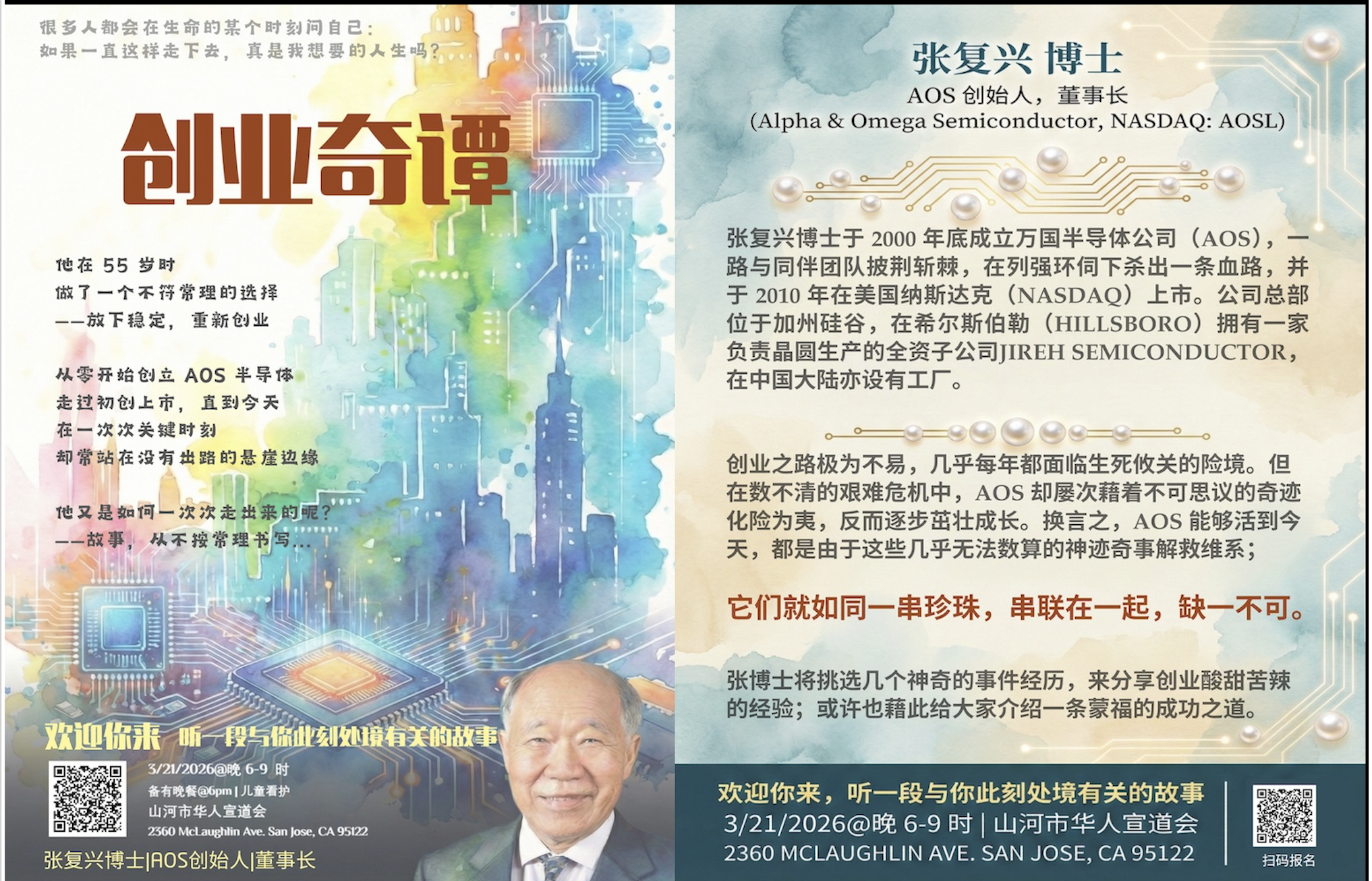 天路事工聯會將在 3 月 21 日週六晚上 6 點- 9 點,將在山河西市華人宣道會(見海報)舉辦一次佈道會。他們邀請到 Alpha Omega Semiconductor (NASDAQ symbol AOSL)半導體公司的創辦人張復興博士/長老來傳講他在這個公司的創業路上所經歷的神奇妙恩典。歡迎您帶家人、朋友一起來聽聽看。
